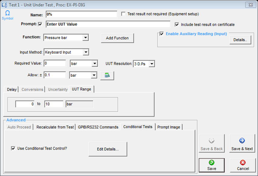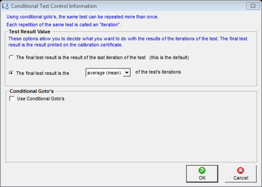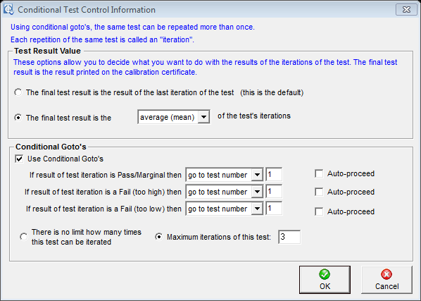Select ‘Use Conditional Goto’s’. For each result type select ‘go to test number’ and enter test number 1.