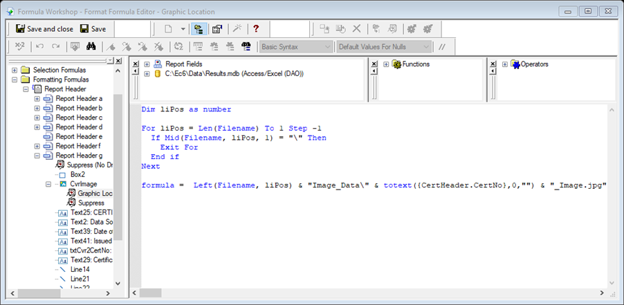 Next formula =  Left(Filename, liPos) & “Image_Data\” & totext({CertHeader.CertNo},0,””) & “_Image.jpg”