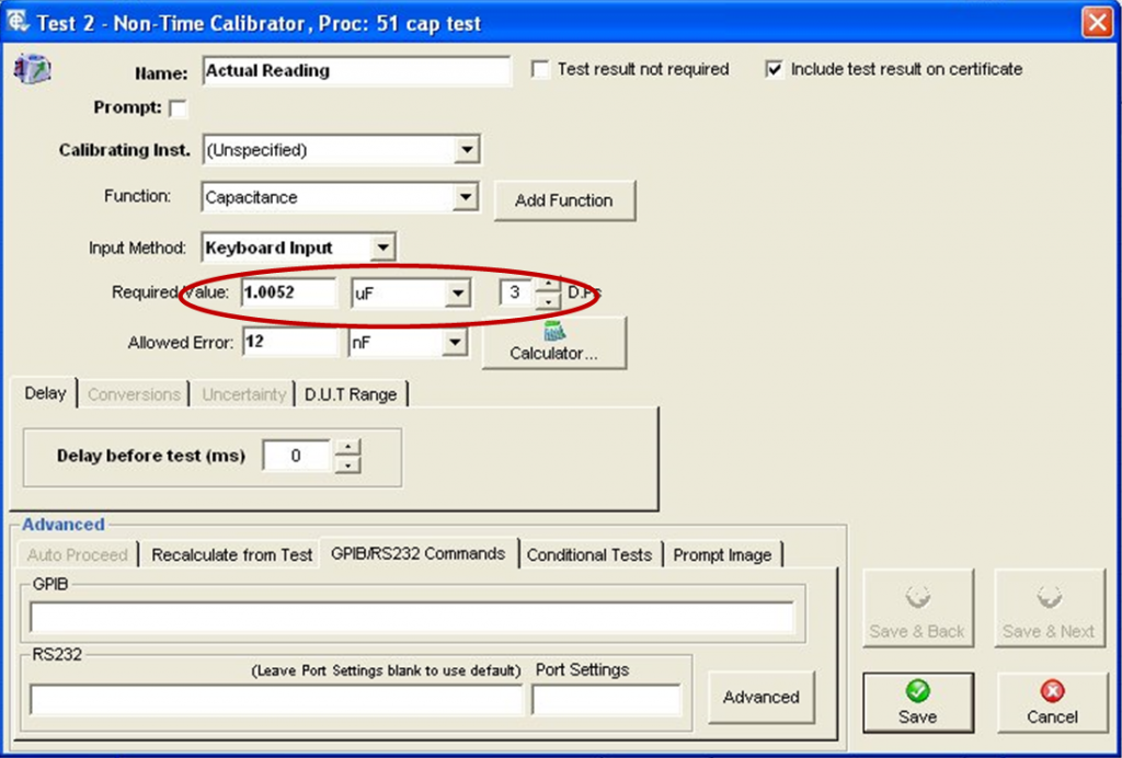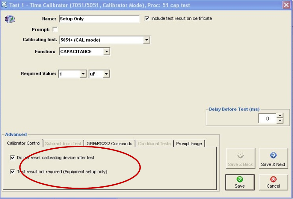 The 5051 or 7051 uses ‘calibrated’ values for capacitance and inductance. These values are present on the calibrator’s certificate or in the 7051/5051 Calibrator Control App. To utilise these values in EasyCal, a ‘setup only’ test is required prior to the device under test reading is entered