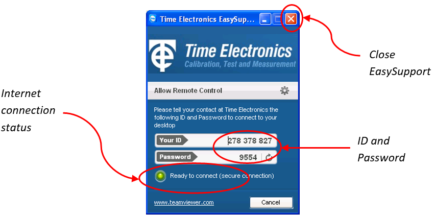 1. When the Internet connection status is green ‘Ready to connect’, please email or talk to your Time Electronics support contact and give them the ID and password. This will allow them to connect to the desktop to provide support.