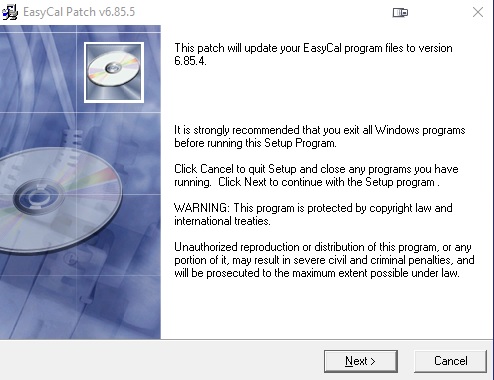 The EasyCal PATCH is a single executable file, typically called EasyCalPatchVxxxx.exe where xxxx is the version which EasyCal will upgraded to when finished.
