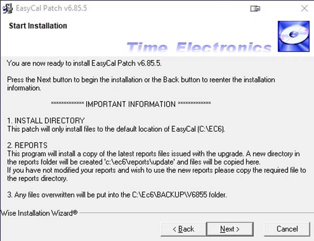 EasyCal upgrades will only work with installations where the Programs folder resides in the C:\EC6 directory. If your installation is located anywhere else, please contact Time Electronics.