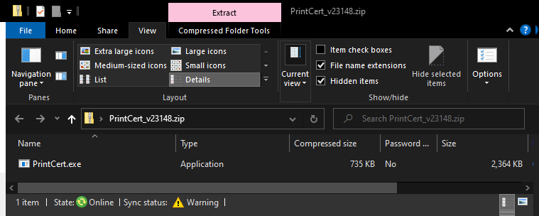 The single application file, in most cases, will be contained in a zip file. This zip file name will identify the application name and version, for example PrintCert_v23128.zip.