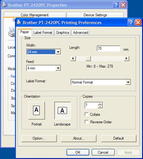 Select ‘Printing Preferences’. Set the Width to 24mm, the standard for a calibration label is 55mm.