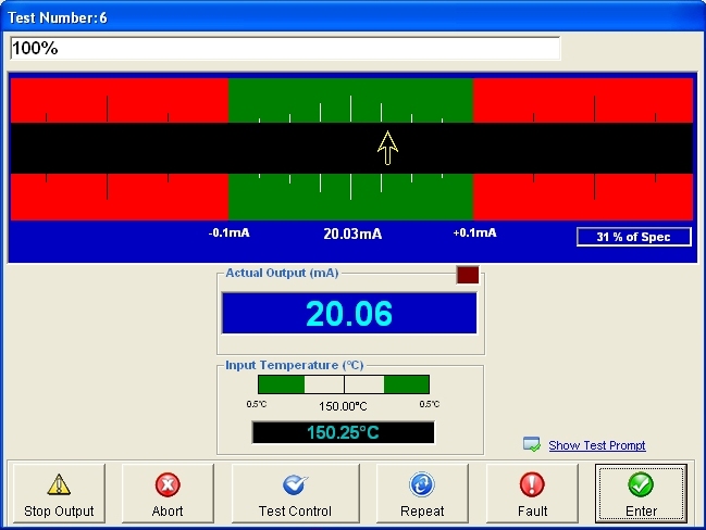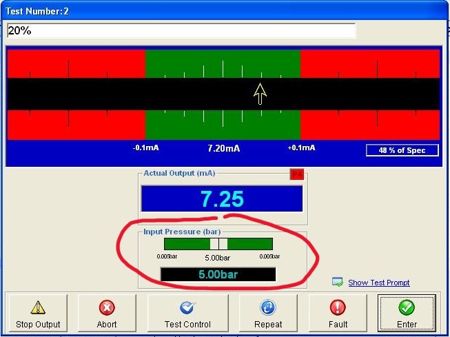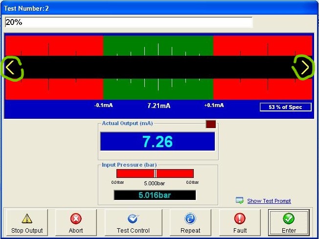 If this feature has been utilised in the procedure the required nominal value (main test value) will be dynamically adjusted as the auxiliary reading changes. In the example below the main required value, 20.03mA has been adjusted from its nominal figure of 20.00mA by the auxiliary (input) value.