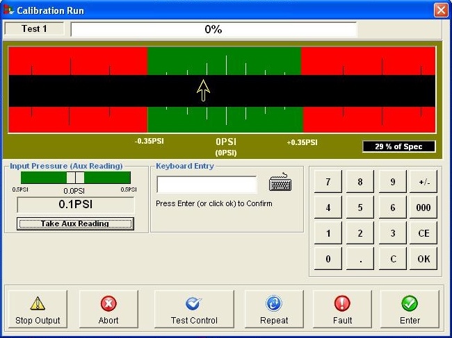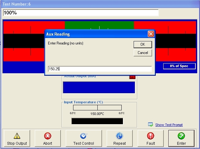 If entering the main reading value via keyboard (a D.U.T type test for example), the auxiliary reading is taken once at the start of the test and again whenever a new value is confirmed. To manually initiate an auxiliary reading, click the ‘Take Aux Reading’ button.