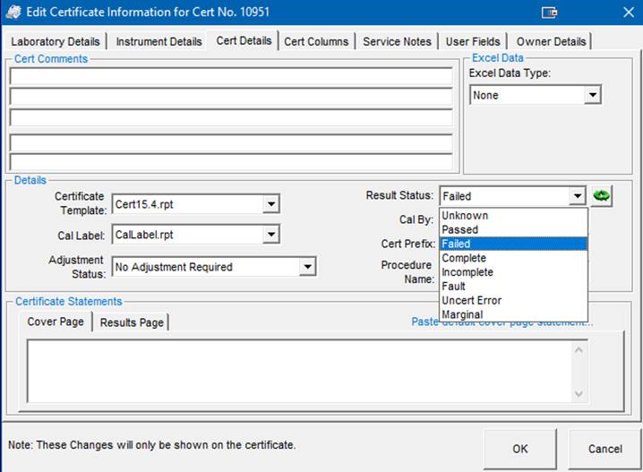 The Certificate Status is automatically set by EasyCal but can be updated in PrintCert by pressing the refresh button next to the Results Status dropdown. If you would like to manually override the status, double click on the words ‘Results Status:’ next to the dropdown menu and it will become active. From here you will have a list of options to choose from. If you do not wish to show the results status on the certificate, select ‘Unknown’.