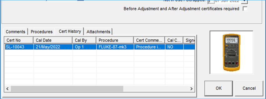 From the Edit Instrument > Certificate History Tab, certificates for the selected can be directly accessed.