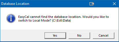 If the data path entered in the network settings is not detected EasyCal will offer to operate in ‘Local Mode’