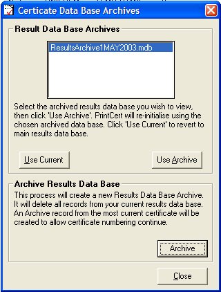 This is useful to free up space in the results data base. Archived results can be viewed by selecting the required archive, and clicking ‘Use Archive’. To revert to the current result data base click ‘Use Current’