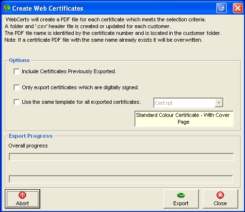 When a WebCert is created, EasyCal flags this so it is not reproduced next time. This allows the WebCert feature to update the directories and CSV when required. If the entire WebCerts directory is being recreated, the option to include certificates previously exported to a WebCert is available.