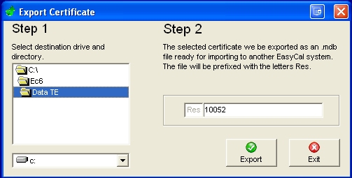 The selected certificate we be exported as an .mdb file ready for importing to another EasyCal system. The file will be prefixed with the letters Res.