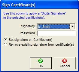 Certificates can be signed digitally. If the Certificate has been digitally signed the signatories name will appear in the certificate listing. Passwords are set in EasyEdit > System Setup.