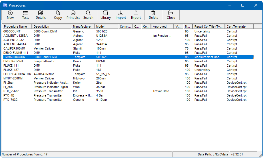A Calibration Procedure contains the information required to control the Calibration Run. Clicking on Procedures from the main EasyEdit menu screen displays the screen shown below.