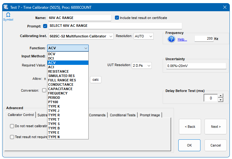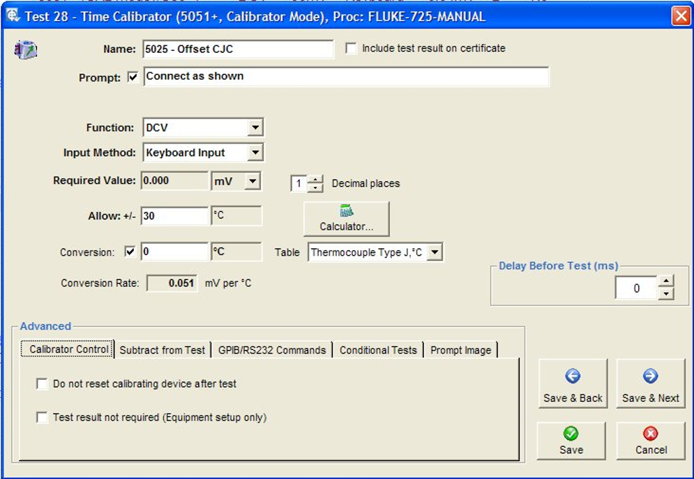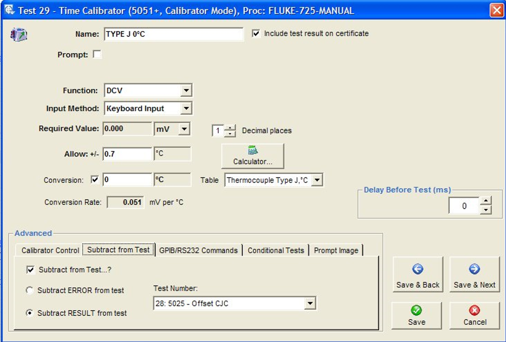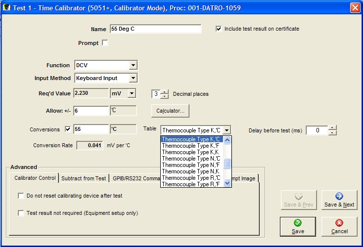 This example shows a 5051 Cal Mode (source) test, using the ‘Thermocouple Type K °C’ Conversion Table to set -55°C. (Also note that a ‘Subtract result of test’ is used for Cold Junction Compensation-see Subtract from test of test section below).