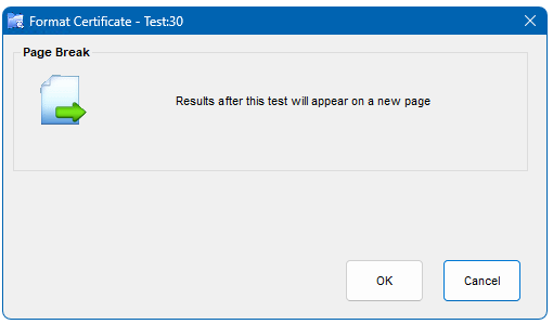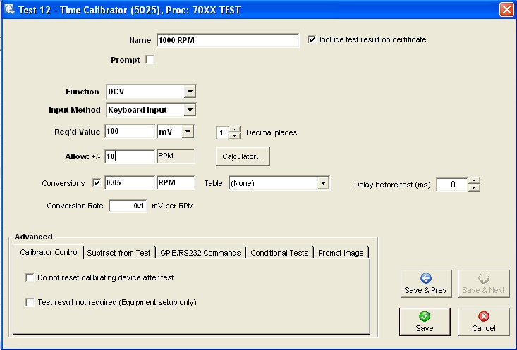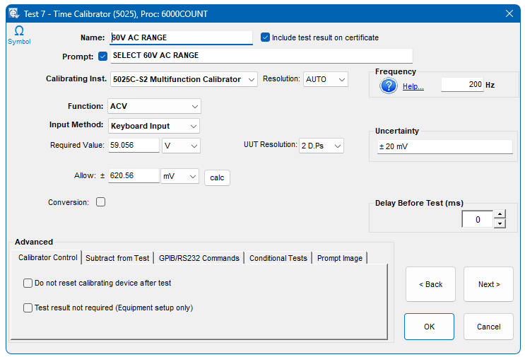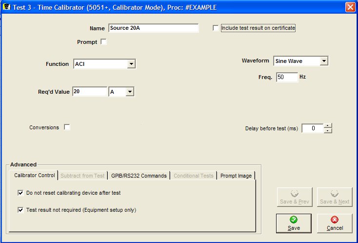 This type does not affect the calibration run and no commands are sent. It simply inserts a line of text in the Calibration Certificate at the place it occurs in the list of tests – maximum length is 50 characters.