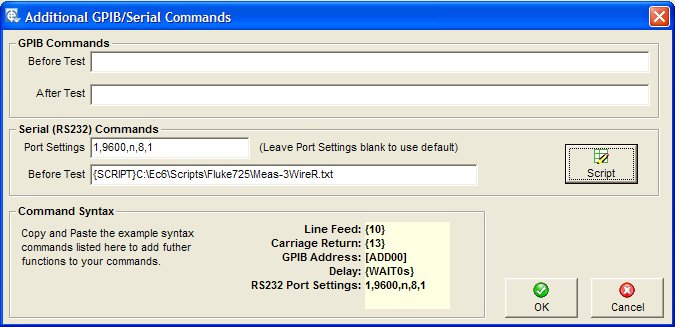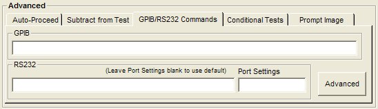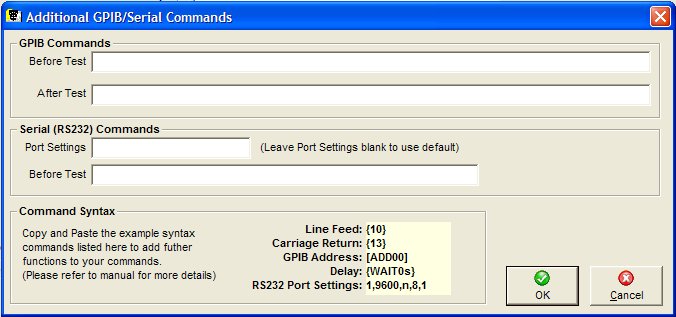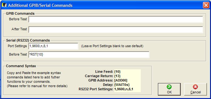Port settings format: <com>, <baud>, <parity>, <databits>, <stopbits>. If only <com> is specified the other parameters default to 9600,N,8,1. As with GPIB, non-printing characters must be enclosed in { }. It should be noted that only one RS-232 instrument can be driven with the command string and it is sent before the test. In the example above “*RST” followed by non-printing character ASCII10 has been sent to COM1 at 9600 baud with NO parity, 8 data bits and 1 stop bit.