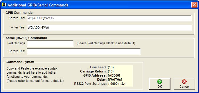 GPIB Commands can be executed before and after a test. If editing the command from the main test window, the command before test can be entered directly.