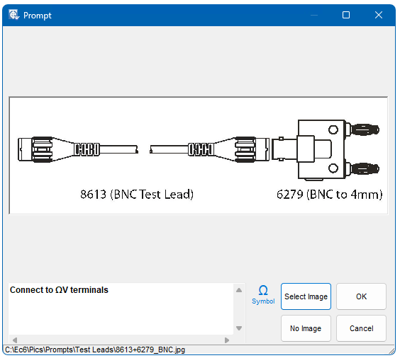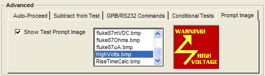 Used to display an image (.bmp & .jpg) before the test is performed. These pictures can indicate lead connections and switch positions for the instrument being calibrated. Image prompts can be any aspect ratio. The window is sizable and the image scales to the size of the window. The picture prompt is also shown in this format during a Calibration Run (CalRun).