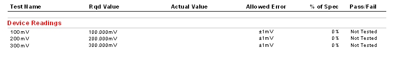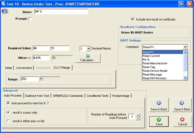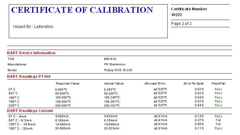 The commands ‘Read PV’, ‘Read Current’ and ‘Read %’ (if available from the sensor) return a numeric value and is shown on the certificate as standard test result.