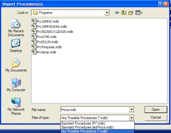 Use this to import data from any EasyCal procedure database. Exported procedure databases are usually prefixed with the letters ‘prc’. Using the ‘Files of type’ drop down menu any possible EasyCal procedure database can be imported, even if it is not prefixed with the letters ‘prc’