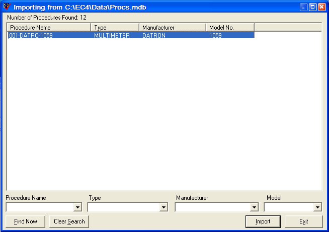 When there are a large number of procedures in the database, the search facility may be used to aid selection. Selection by Procedure Name, Instrument Type, Manufacturer and Model is supported. Drop-Down lists for each give the user a choice from alphabetic listings compiled from the information already in the database.