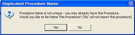 If you click Yes, it will then prompt you for a new ID or Procedure Name. You must change the Procedure Name to a name that is not already in use. At the end of the import, the number of records imported will be displayed.