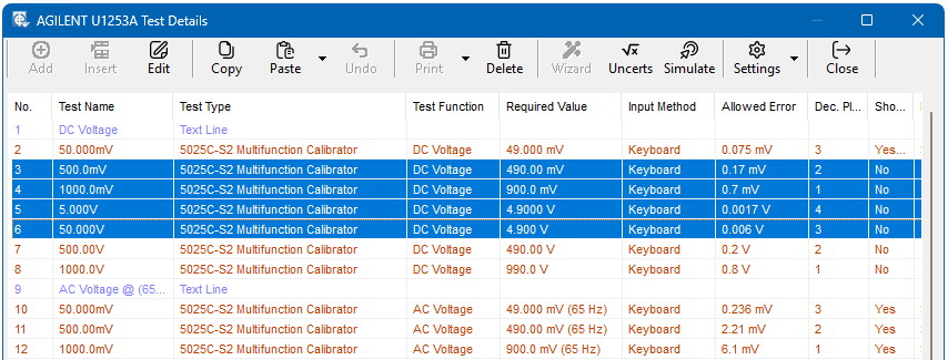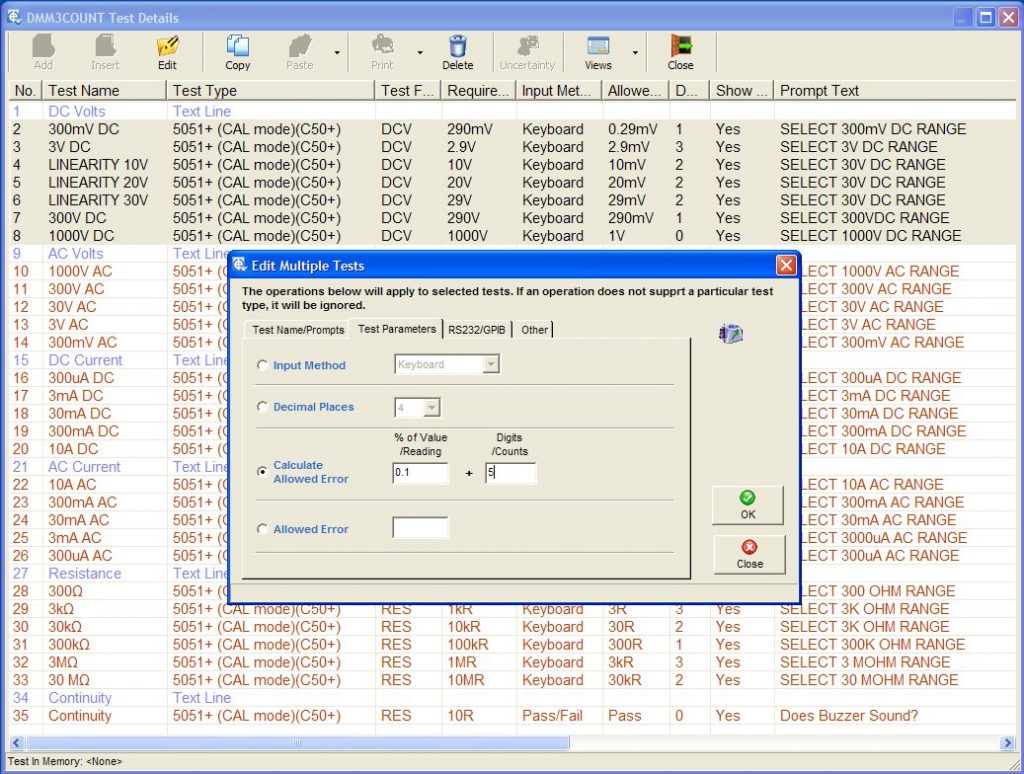 To modify the ‘Allowed Error’ for all DC Voltage tests, highlight the required tests. Click Edit, the Edit Multiple Tests window will appear. Enter the specification details. In the example above the specification is 0.1% of reading + 5 counts. The allowed error for all highlighted tests will now be set as required.