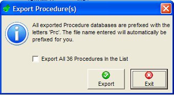 Either the selected procedure or entire list can be exported to a database file. This file can then be used by other EasyCal users to import procedures. Note all exported procedures will be prefixed with Prc