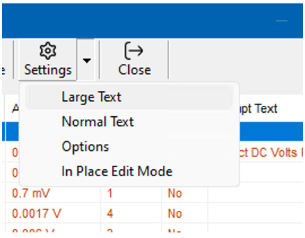 Large / Normal Text: The test list view can be altered to show a large or standard font size. This can help with reading or allow more test rows on the screen.