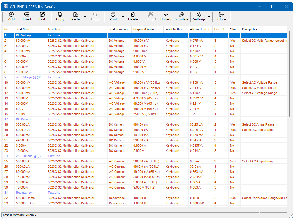 All tests are identified numerically and the first test is always No. 1. The sequence of testing in CalRun is always strictly in test number order. When tests are inserted and/or deleted, the numbering is automatically adjusted to ensure that the list is always complete and in numerical order.