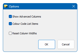 Reset Column Widths: Column widths are saved each time they are adjusted. If required these can be set to back to the default widths.