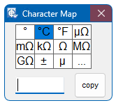 Throughout various sections in EasyCal Symbol feature is available. Click on this and a character map of useful symbols which are not commonly available on a standard keyboard to be entered, such as the ohms symbol, will appear. Use the copy button and then paste where required.