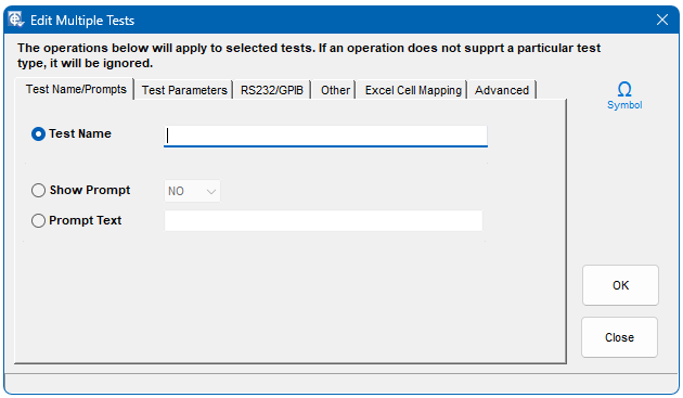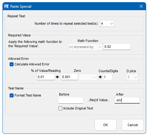 The selected test’s required (setup) value can be incremented or multiplied by the value entered. A calculated allowed error can be applied to each test repeated, which is based on the incremented or multiplied required value. The test name can also be formatted using the required value. Text can be entered before and after the required value which will be repeated for each test.
