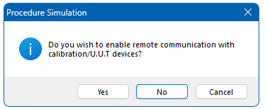 This performs a simulated calibration run, without the need to save results. The option to disable communication (RS232 or GPIB) to a calibrator or device under test is available. These means a procedure can be tested easily. To edit test parameters while running the procedure, switch between the 2 programs using the task bar.