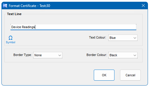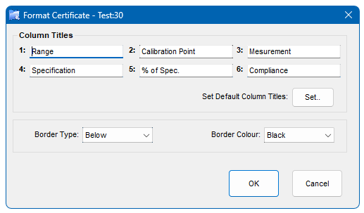 Column titles can be entered on a test by test basis. This allows a certificate which contains different test types to be formatted effectively. If this option is used the main column titles set in the procedure details can be left blank.