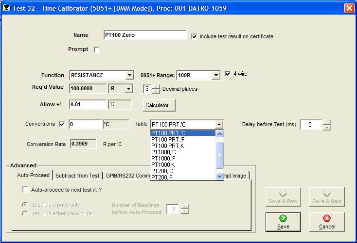The example above shows a 5051 DMM Mode (measure) test, using the ‘PT100 °C’ Conversion Table, to read the output of a PT-100 simulator at 0°C