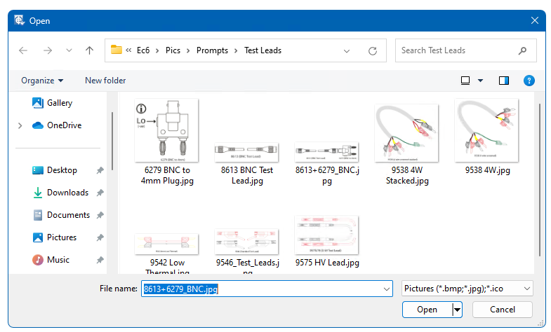A set of Time Electronics test lead images is provided to assist with procedure development. These are located in the Pics\Prompts\Test leads directory.