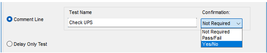 A simple comment test can be performed. The user is prompted to enter a comment during the test run. The type of confirmation, if required, is selected from the drop down menu.