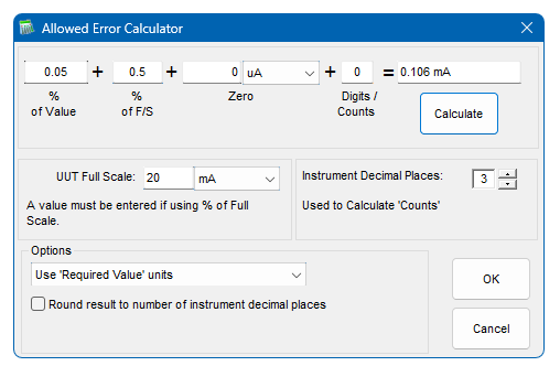 Note: When using the ‘Conversion’ option, the Allowed Error and Calculator use the Converted Value Units. Converted Value and Units will appear on the Calibration Certificate, and the Calibration Run screens will display using the Converted Value and Units.
