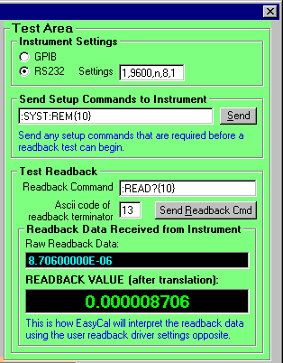Enter the command needed to cause a single readback string to be sent by the instrument. E.g. with an HP DMM 34401 the command is “:READ?”. Again remember the terminating character if required. When you click the “Send Readback Cmd” button, this command is sent and the data readback will be displayed in the “Raw Readback Data” window.