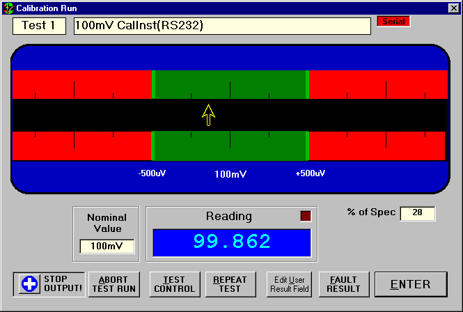 The Reading box contains the last value read from the readback instrument, and the needle on the bar above it shows whether the value is within specification or not.