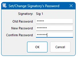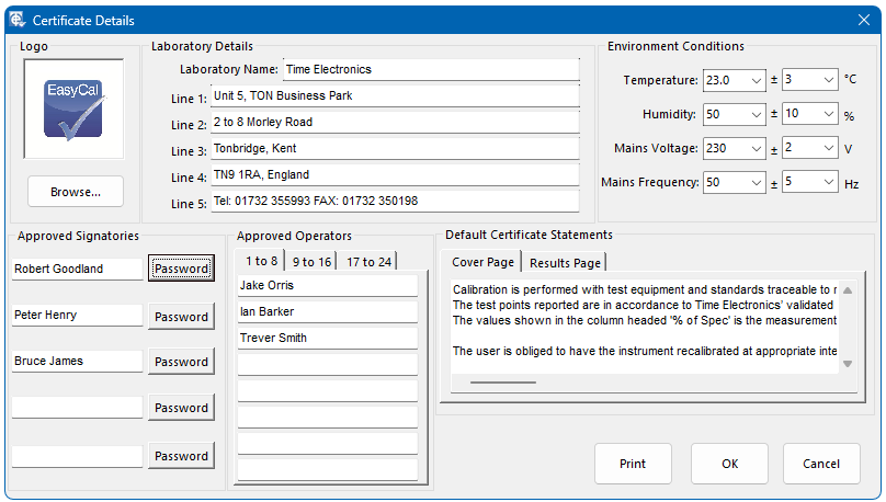 EasyCal allows up to five signatories to be named. These will appear on the Calibration Certificate. Certificates can be digitally signed by a password. The default password for signatory 1 is “1”, signatory 2 is “2” and so on. Proof that a certificate has been ‘digitally signed’ will be shown in PrintCert’s certificate listing. This also allows the appropriate scanned signatures to appear on the Certificate if required.