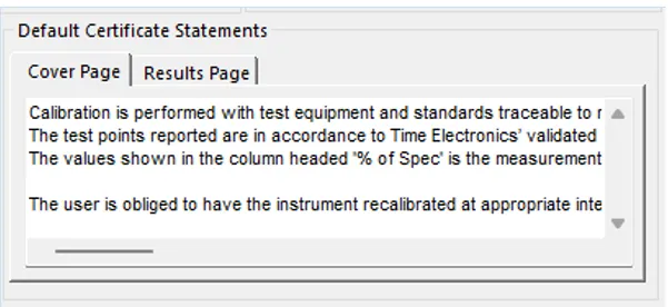 Statements can be added to the certificate cover page and at the end of the results page.Default comments are entered in the Certificate Details section of EasyEdit.The default statements can be pasted into each procedure, or unique statements for any procedure can be made.