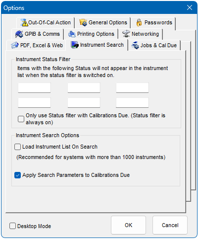 Used to filter instruments by Status. If an instrument has a status entered here it will not be shown in the instrument list. This can be applied only to Calibrations Due.