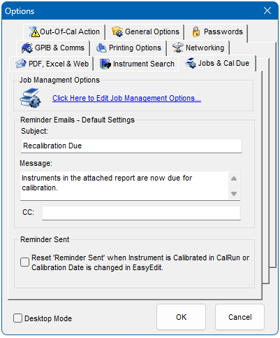 Default settings for the email subject, message and CC are entered here. These can also be edited when producing reminder emails. The reminder sent date can be reset automatically when a calibration is performed in CalRun.