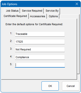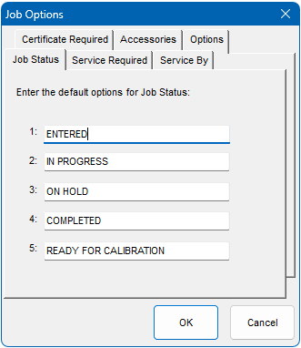 Up to 5 default entries can be made for Job Status, Service Required, Service By and Certificate Required. These will be available for selection in EasyEdit’s ‘Job Management’ as shown below.