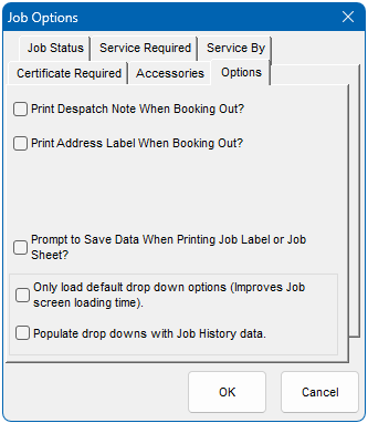 When a job is booked out (despatched) the option to print a Job Label and/or an Address Label is specified here.