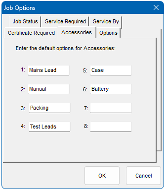 The default accessories returned with an instrument are specified here. Up to 8 items are allowed. There is also the option to enter a non- specified accessory when booking in.