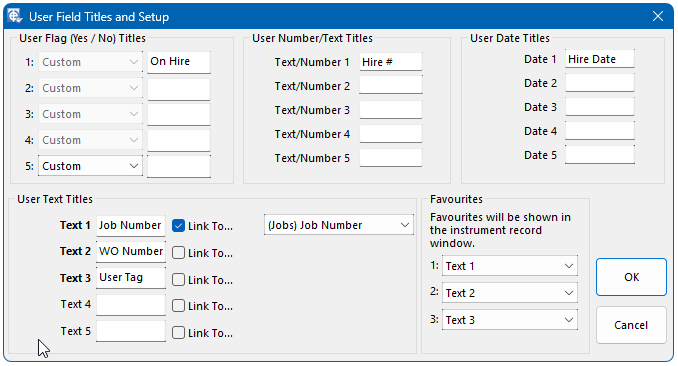 Up to 3 user fields can be shown in the main instrument record window. The favourites are selected in the User Field setup window. In the ‘Favourites’ sections select the fields from the drop-down lists. The selected ‘favourite’ name will be shown in bold.